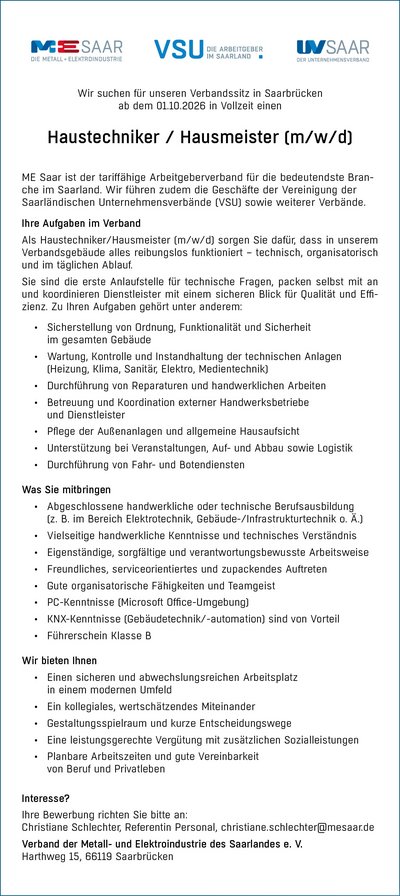 ME Saar sucht Haustechniker/Hausmeister (m/w/d)